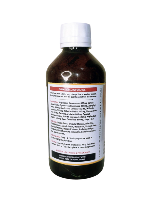 Femin 30 - Syrup is useful in Leucorrhoea, Irregular Menses, Infertility, Painful Menses, Anemic issue, Waist Pain, Stomach Pain, Stomach Swelling, Hunger Problem, Reducing weight, Headache, Blood Pressure, Irritability, Female reproduction, Spinal erosion etc.,